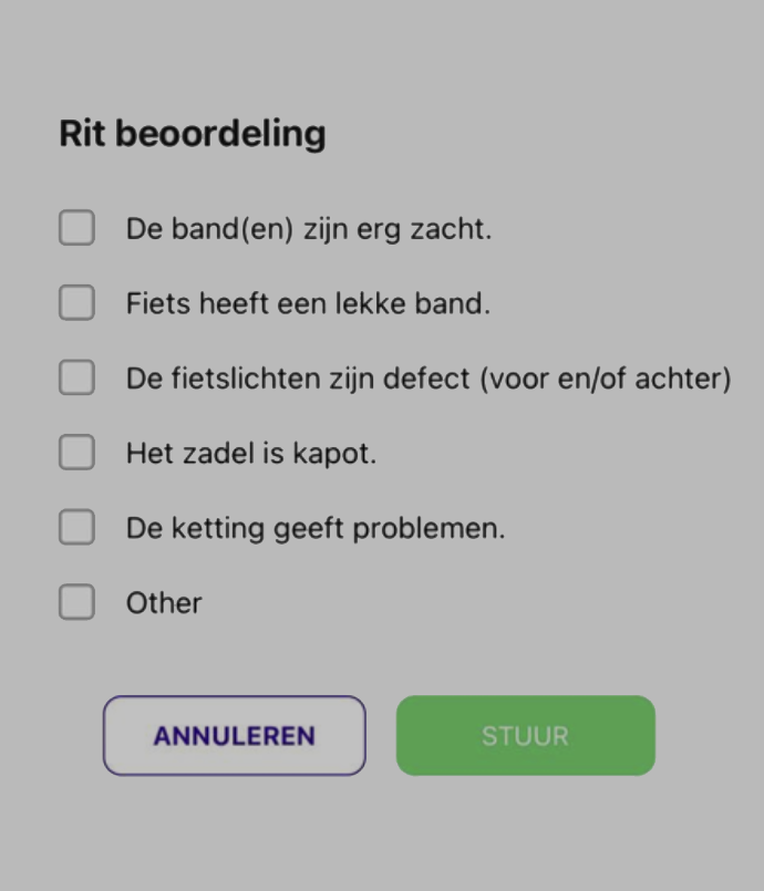 Na het afsluiten van de reserveringssessie kunnen eventuele defecten of problemen in de Moovlr app worden aangegeven. We ontvangen graag gedetailleerde informatie via het feedbackformulier.